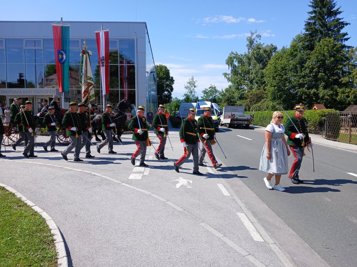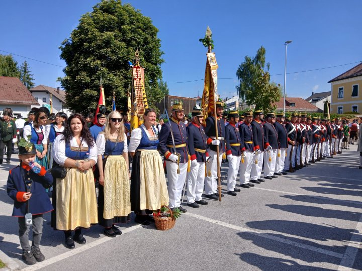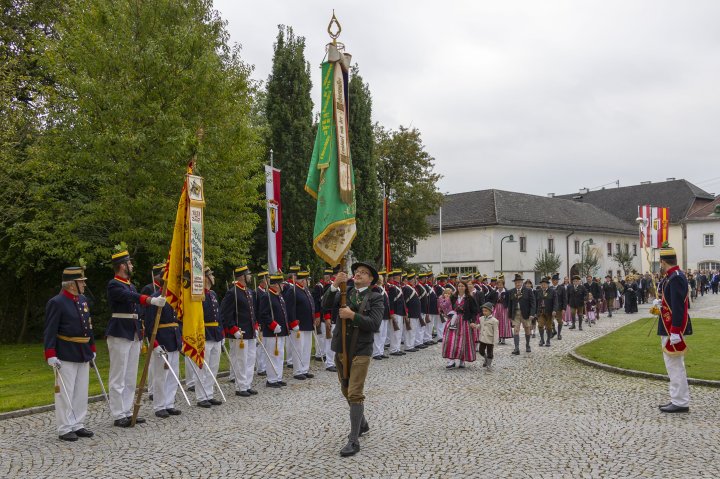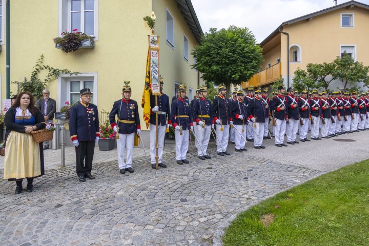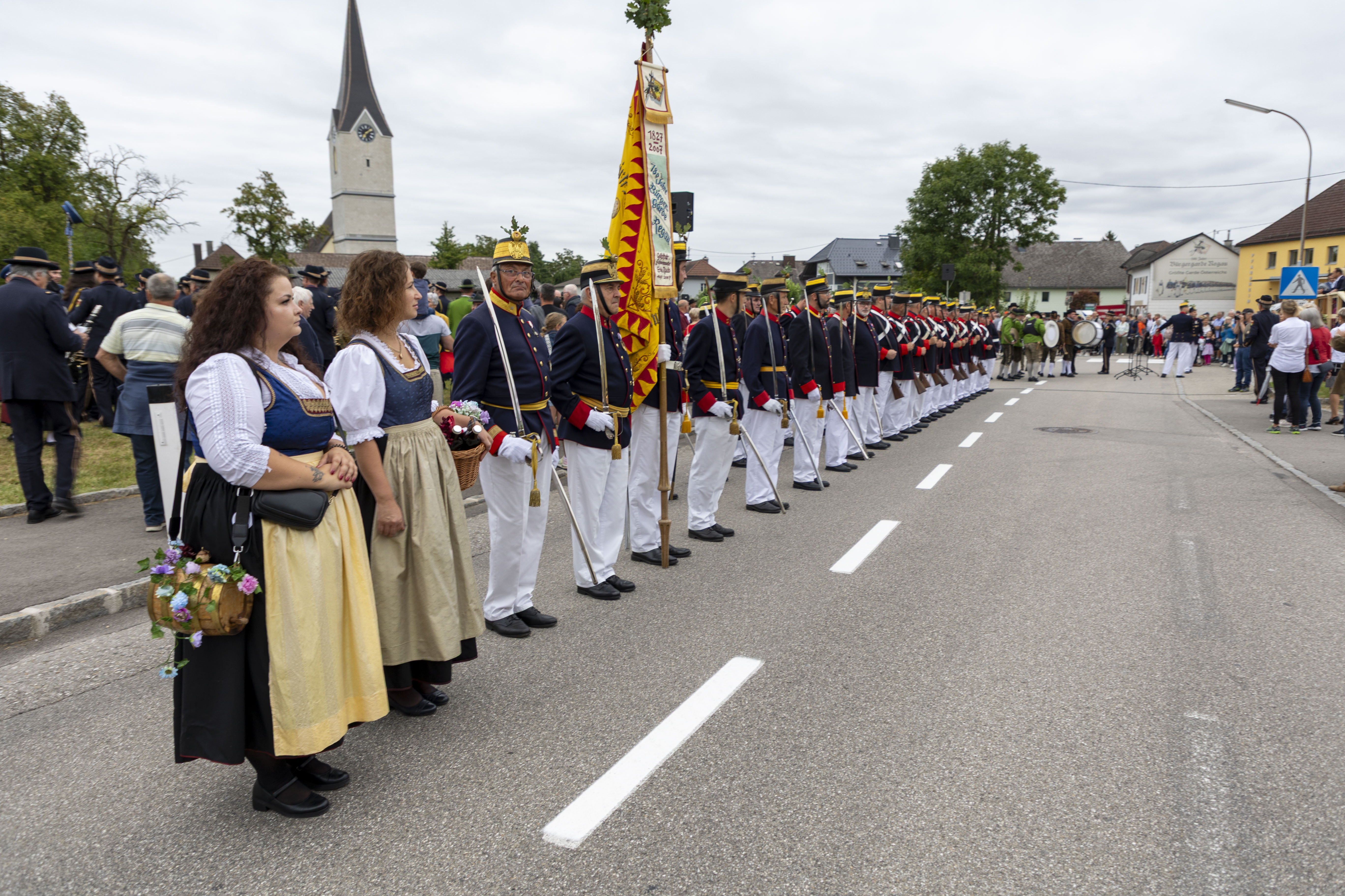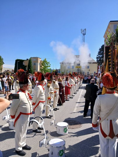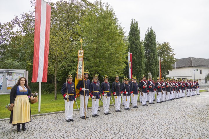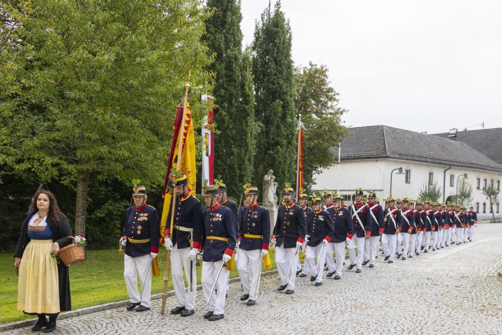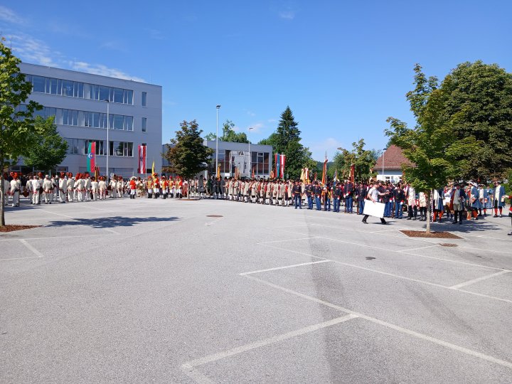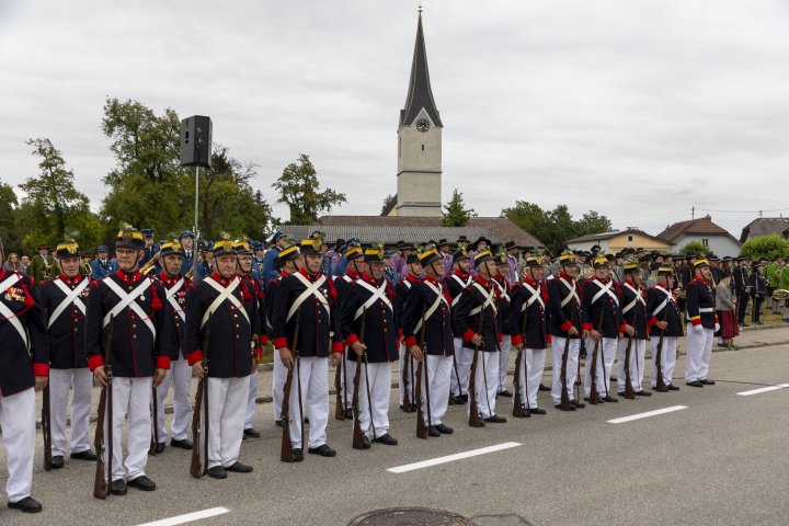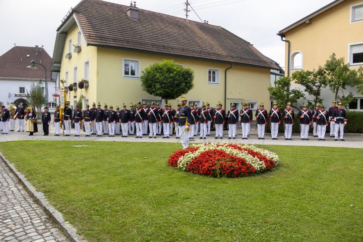 Das Wetter war den Veranstaltern hold. Bei wunderschönem Sommerwetter zogen die zahlreichen Uniformierten, rund 1.200 an der Zahl, auf dem Festplatz beim Schulzentrum ein, wo sie während des Festaktes ganz schön ins Schwitzen kamen. Der Festakt wurde mit einem Grandioso, gespielt durch alle anwesenden Musikkapellen, und einer Meldung an Landeskommandant Mjr. Christian Frech eröffnet. Es folgte die Begrüßung durch den Festobmann und Kommandant der Bürgergarde Mattighofen, Olt. Christian Raiger, bevor der katholische und der evangelische Priester einen ökumenischen Gottesdienst zelebrierten. Angesichts der Hitze begnügten sich die Ehrengäste löblicherweise mit kurzen Festansprachen, sodass nach dem Ehrensalut durch die Bürgergarde Friedburg rasch ausmarschiert werden konnte. Vorbei an zahlreichen Zuschauern führte der Festzug über den Stadtplatz, wo vor der Gastgeber-Garde und den Ehrengästen defiliert wurde.