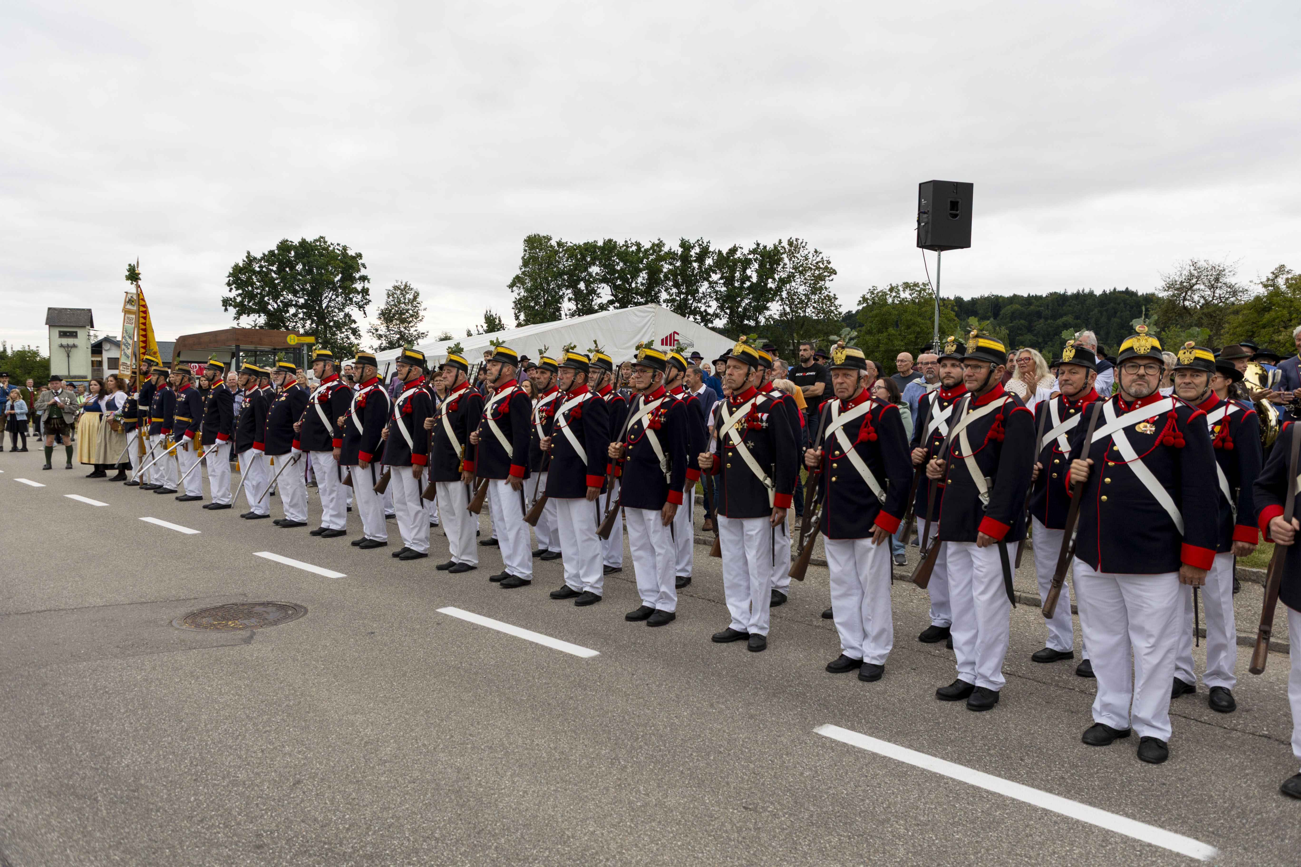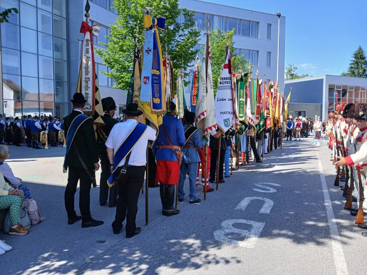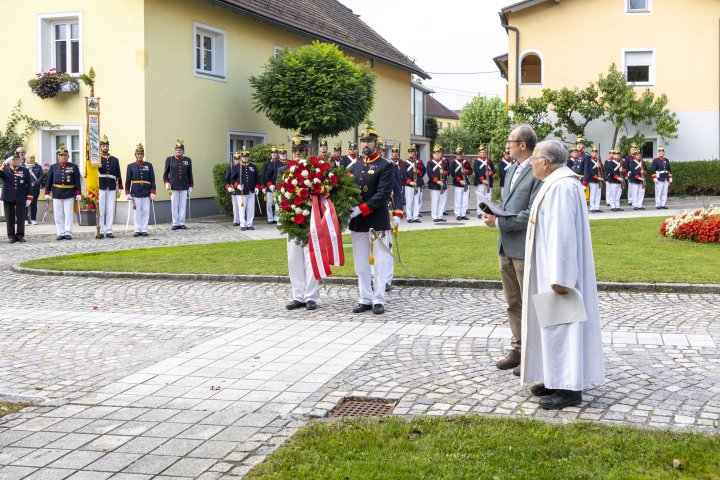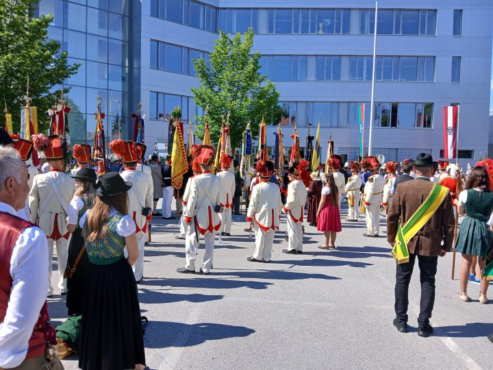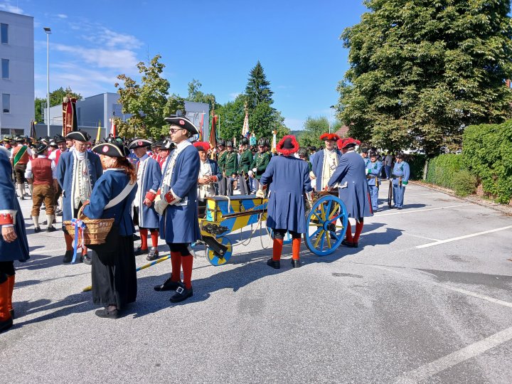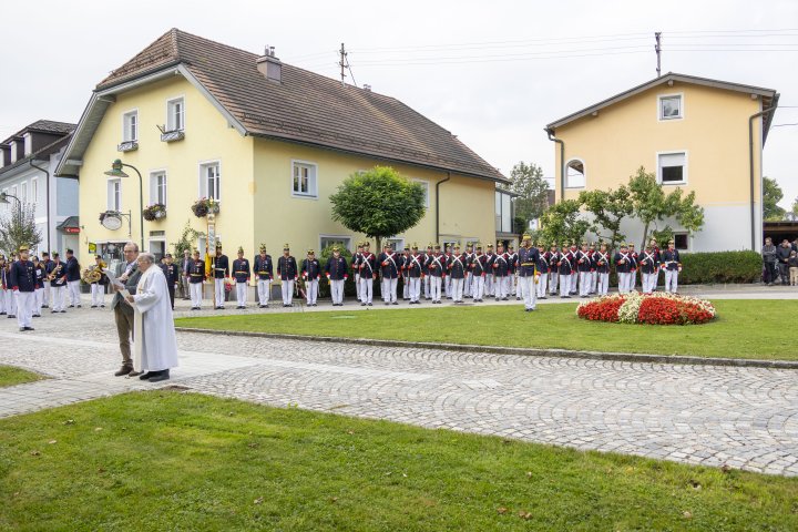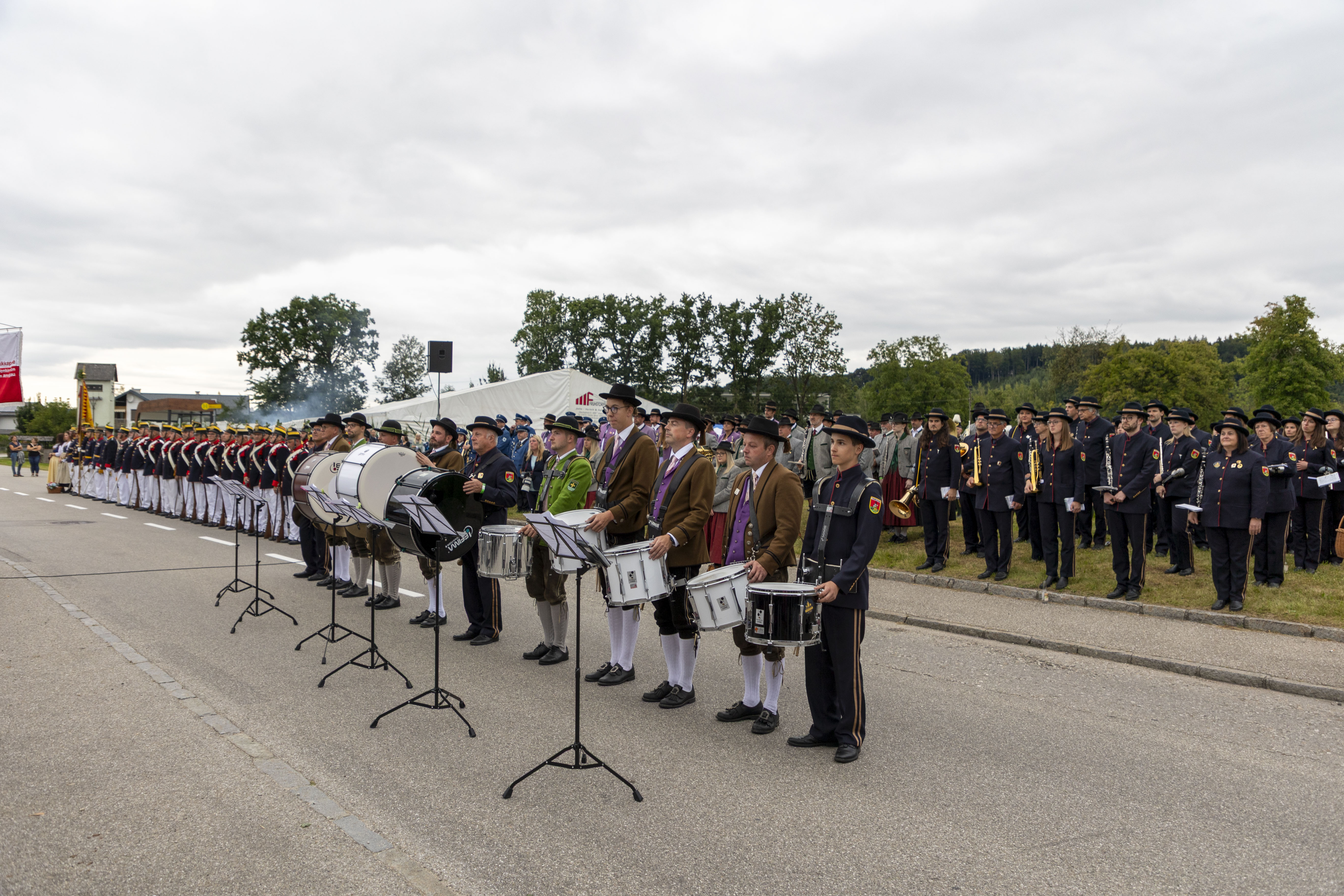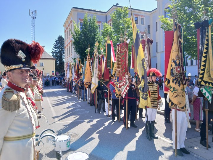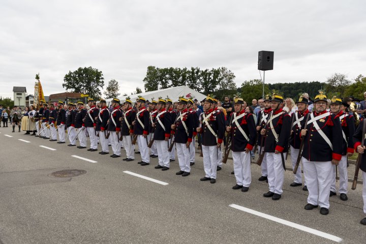 Das Wetter war den Veranstaltern hold. Bei wunderschönem Sommerwetter zogen die zahlreichen Uniformierten, rund 1.200 an der Zahl, auf dem Festplatz beim Schulzentrum ein, wo sie während des Festaktes ganz schön ins Schwitzen kamen. Der Festakt wurde mit einem Grandioso, gespielt durch alle anwesenden Musikkapellen, und einer Meldung an Landeskommandant Mjr. Christian Frech eröffnet. Es folgte die Begrüßung durch den Festobmann und Kommandant der Bürgergarde Mattighofen, Olt. Christian Raiger, bevor der katholische und der evangelische Priester einen ökumenischen Gottesdienst zelebrierten. Angesichts der Hitze begnügten sich die Ehrengäste löblicherweise mit kurzen Festansprachen, sodass nach dem Ehrensalut durch die Bürgergarde Friedburg rasch ausmarschiert werden konnte. Vorbei an zahlreichen Zuschauern führte der Festzug über den Stadtplatz, wo vor der Gastgeber-Garde und den Ehrengästen defiliert wurde.