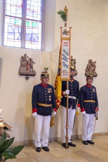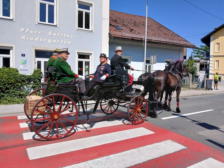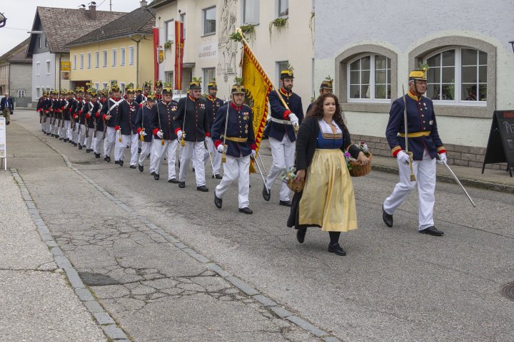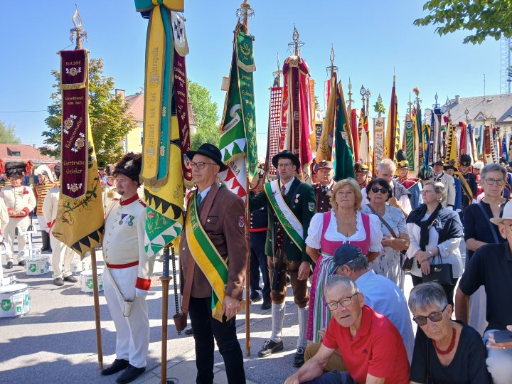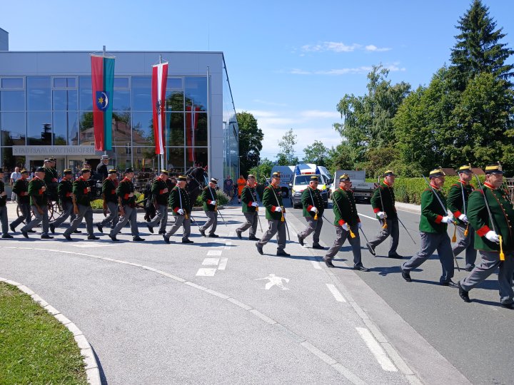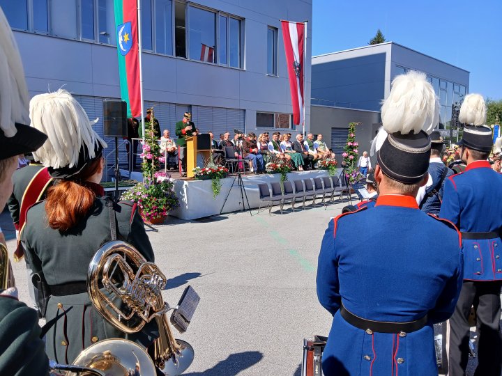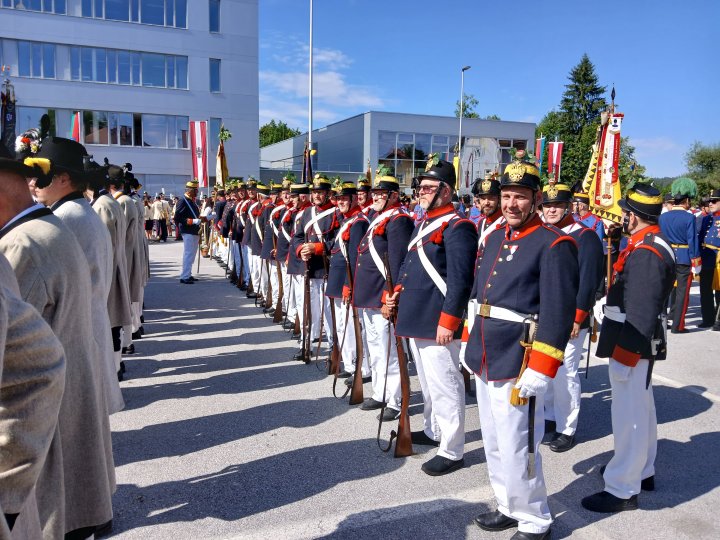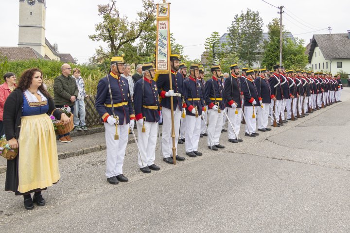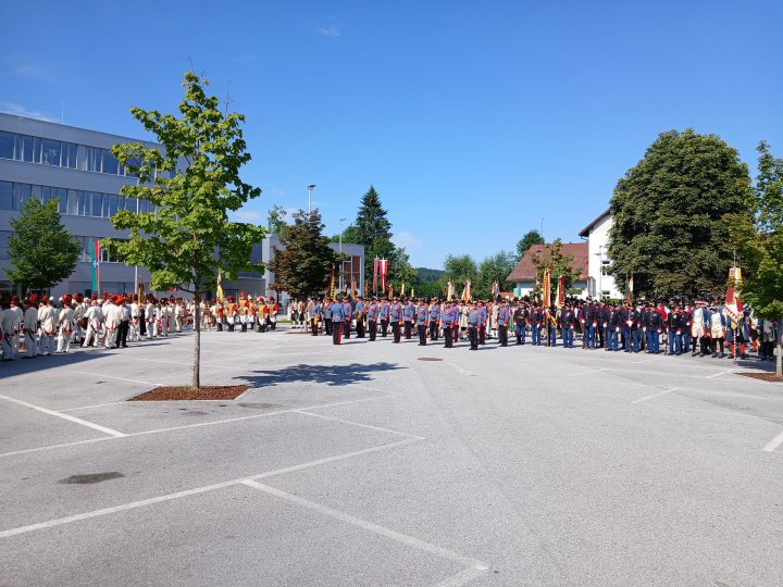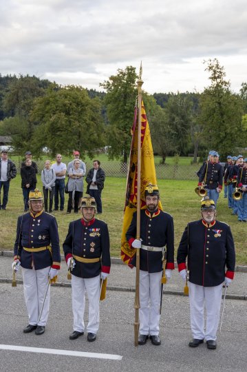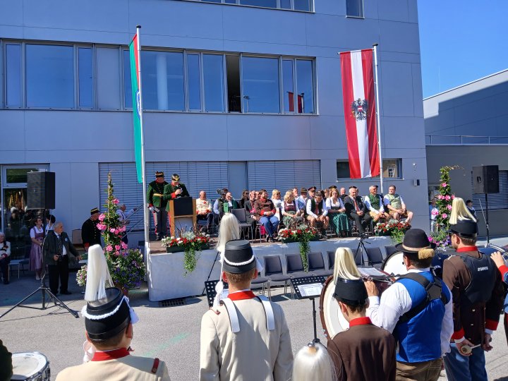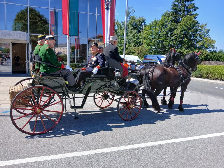 Das Wetter war den Veranstaltern hold. Bei wunderschönem Sommerwetter zogen die zahlreichen Uniformierten, rund 1.200 an der Zahl, auf dem Festplatz beim Schulzentrum ein, wo sie während des Festaktes ganz schön ins Schwitzen kamen. Der Festakt wurde mit einem Grandioso, gespielt durch alle anwesenden Musikkapellen, und einer Meldung an Landeskommandant Mjr. Christian Frech eröffnet. Es folgte die Begrüßung durch den Festobmann und Kommandant der Bürgergarde Mattighofen, Olt. Christian Raiger, bevor der katholische und der evangelische Priester einen ökumenischen Gottesdienst zelebrierten. Angesichts der Hitze begnügten sich die Ehrengäste löblicherweise mit kurzen Festansprachen, sodass nach dem Ehrensalut durch die Bürgergarde Friedburg rasch ausmarschiert werden konnte. Vorbei an zahlreichen Zuschauern führte der Festzug über den Stadtplatz, wo vor der Gastgeber-Garde und den Ehrengästen defiliert wurde.