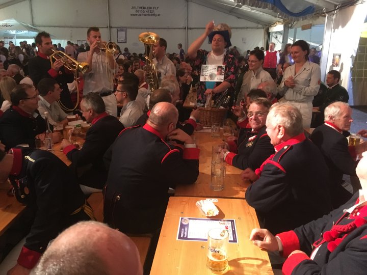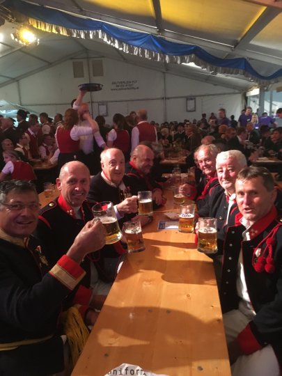 Die Ausrückung anlässlich des 140-jährigen Bestandsjubiläums des Marktmusikvereins Altmünster fiel immerhin nicht ganz ins Wasser. Bei Dauerregen am Abend des 2. September konnten zwar Bürgergarde und Korpskapelle nicht gemeinsam aufmarschieren, weil der Festzug abgesagt wurde. Jedoch ließen es sich die Kameraden der Bürgergarde nicht nehmen, zu den Klängen des Rainermarsches und unter Beifall der Festgäste eine Ehrenrunde durch das gut gefüllte Festzelt zu marschieren. Wieder im Freien, rundete ein lauter Salutschuss diese kurze Ausrückung der besonderen Art ab, bevor man gemeinsam mit den Musikern die ausgelassene Stimmung im Festzelt genoss und das ein oder andere Gläschen hob.