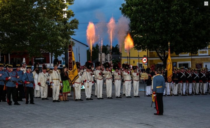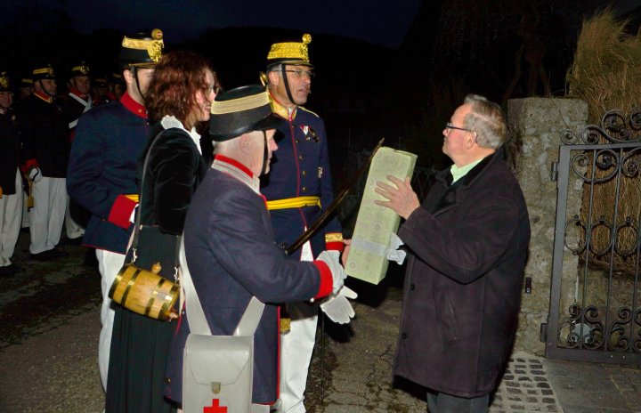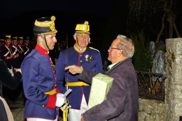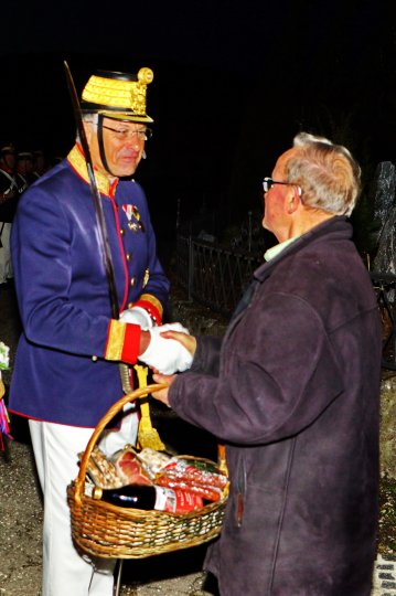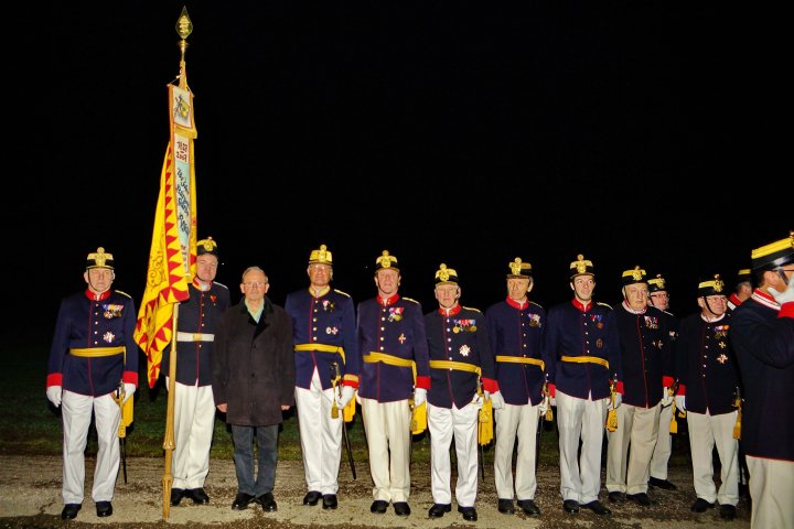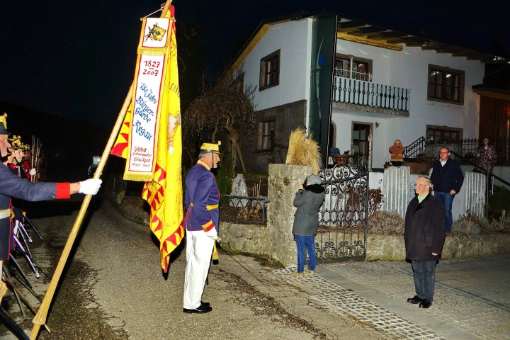 Im Anschluss ergriff Ehrenobmann Obstlt. Josef Baumgartner das Wort und bedankte sich für die überraschende Ausrückung anlässlich seines 80. Geburtstages. Als bleibende Erinnerung überreichte er dem Bürgerkorps zwei selbst gefertigte Marmortafeln, welche das Gründungsjahr der Bürgergarde und ihre Kommandanten anführen.