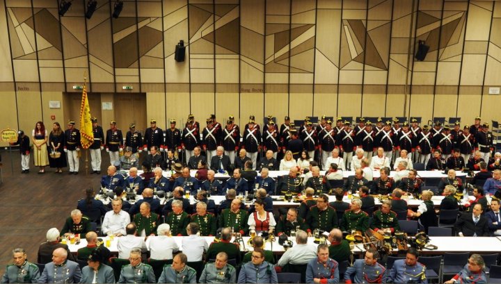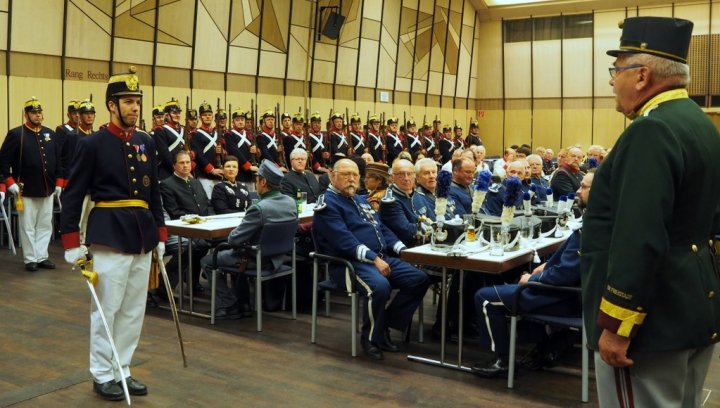 Nicht nur das Programm der diesjährigen Generalversammlung am 26. März war dicht, auch die Räumlichkeiten im Hotel Weinberg waren gut gefüllt. Neben den Kameraden der Bürgergarde waren auch die Mitglieder der Bürgerkorpskapelle stark vertreten und sorgten für musikalische Erheiterung der Veranstaltung. Auch Fahnenmutter Erika Raab schloss sich der Versammlung an und erhielt als Dankeschön für Ihre Unterstützung einen Blumenstrauß überreicht.
