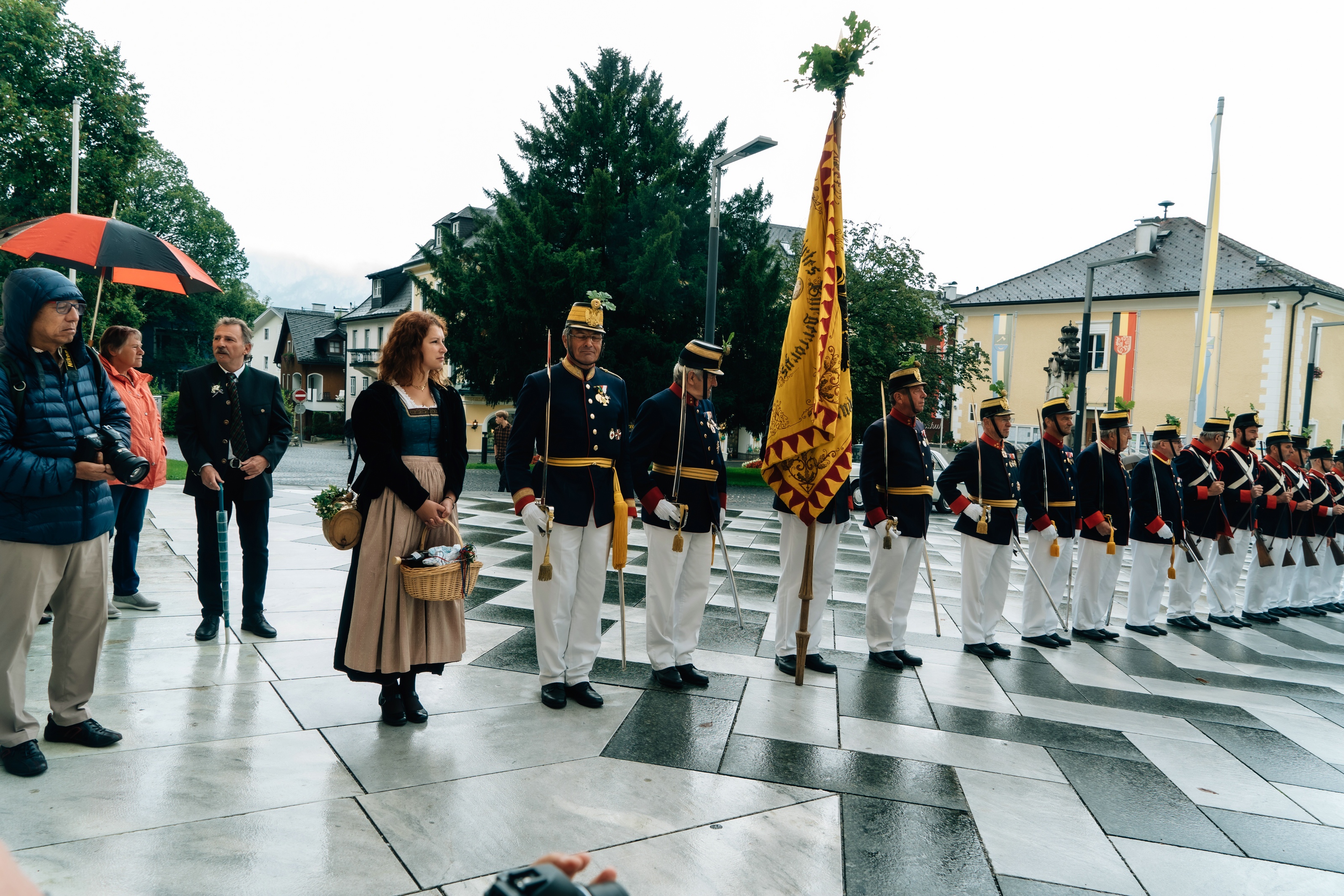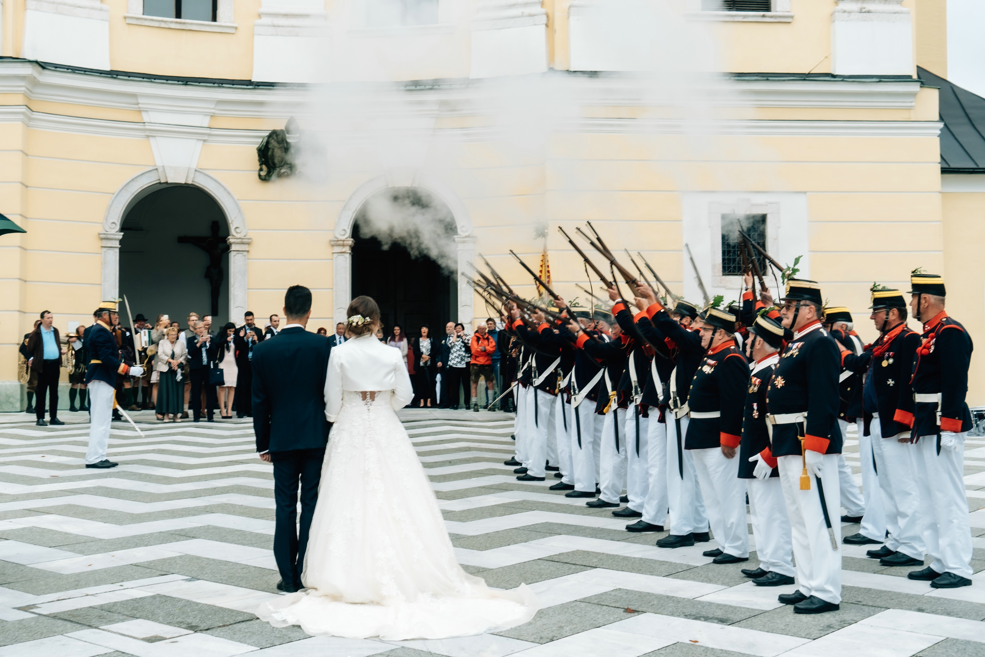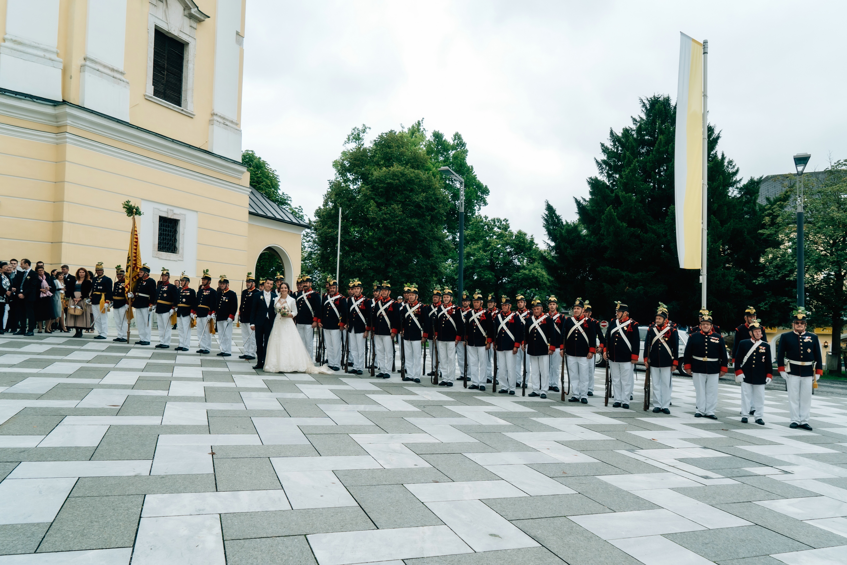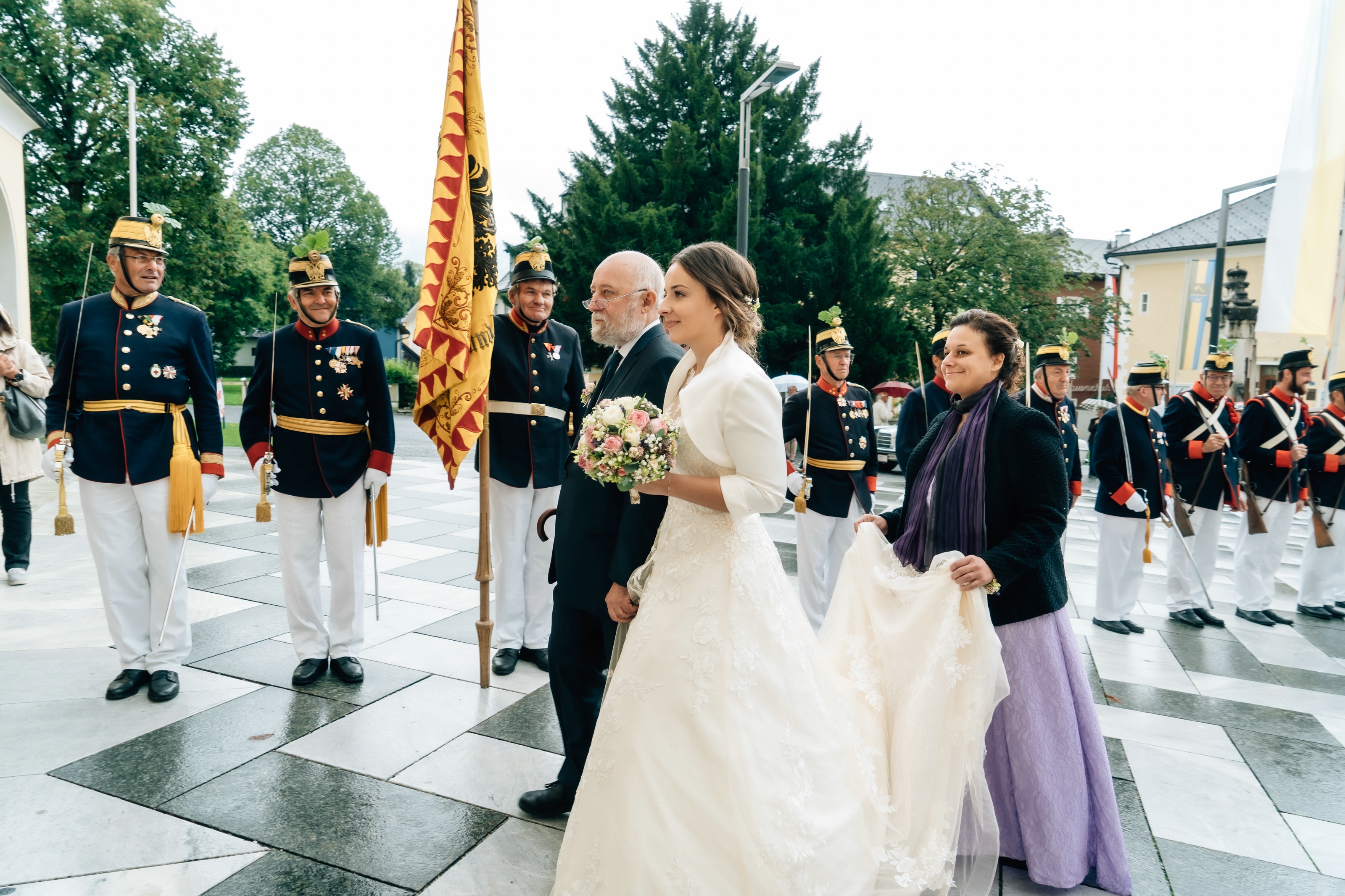 Obmann Mario Niederfriniger und seine Verlobte Charlotte Unterweger feierten am 7. September in der Basilika Mondsee ihre kirchliche Vermählung. Auch eine stark vertretene Bürgergarde folgte der Einladung und reiste zur Hochzeit an. Nach dem Einmarsch auf dem großen Kirchenvorplatz folgte der Einzug in die Kirche und ein stimmungsvoller Gottesdienst, wo sich die beiden Brautleute das Ja-Wort gaben. Beim Auszug stand die Bürgergarde dann unter den Augen zahlreicher Zaungäste Spalier. Nach der Meldung ließ sie das Brautpaar mit einer Ehrensalve hoch leben. Kommandant Hubert Niederfriniger, die Obmann-Stv. Herbert Schwarz und Josef Achleitner sowie Marketenderin Helene Enser gratulierten dem Brautpaar herzlich und stießen mit ihnen auf einen guten weiteren Lebensweg an. Im Anschluss waren alle Hochzeitsgäste zum Hochzeitsmahl im Gasthaus zum Fidelen Bauern in Oberwang eingeladen.