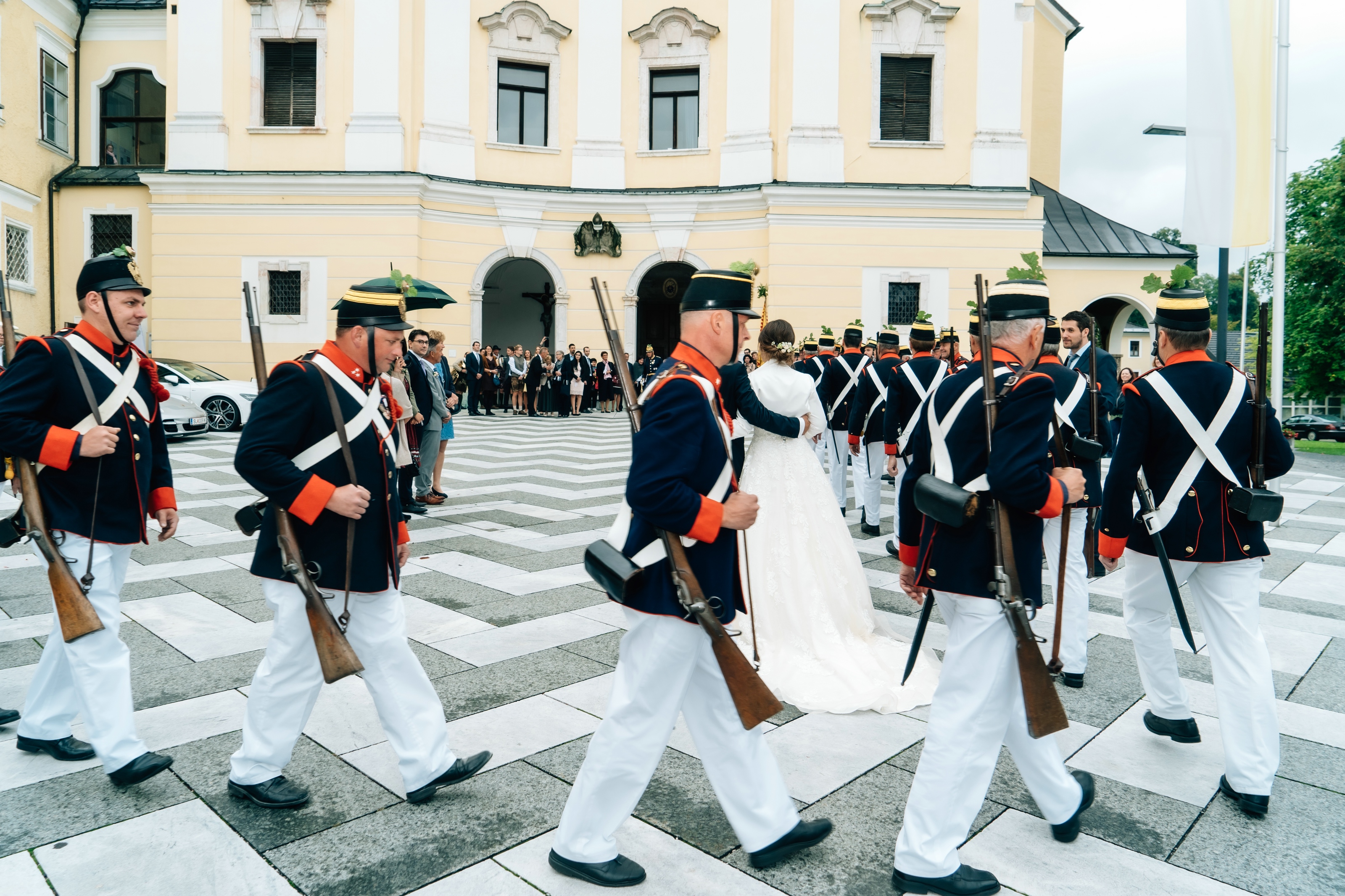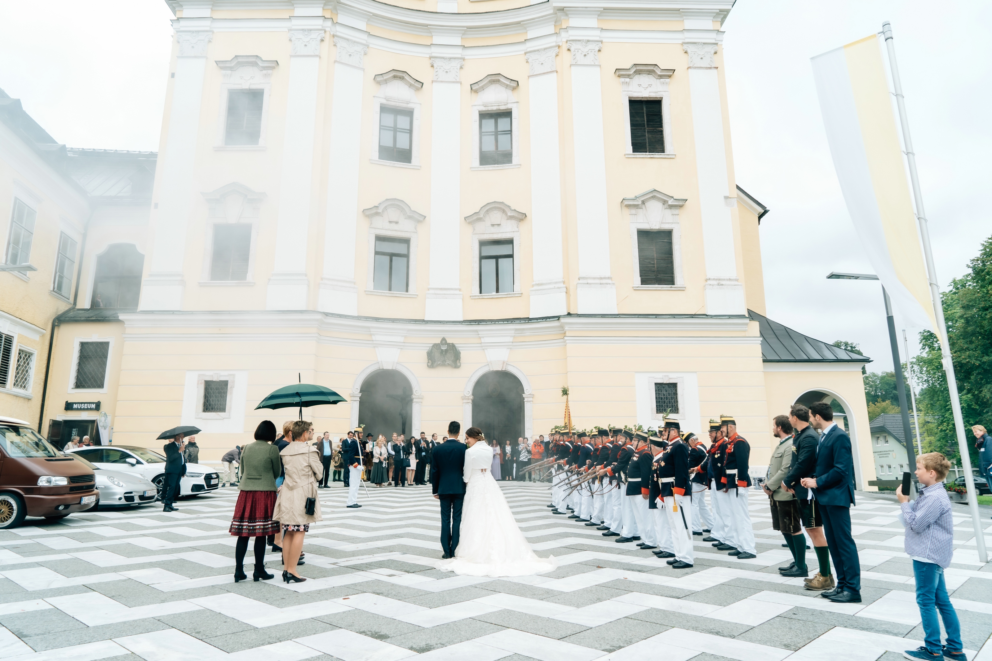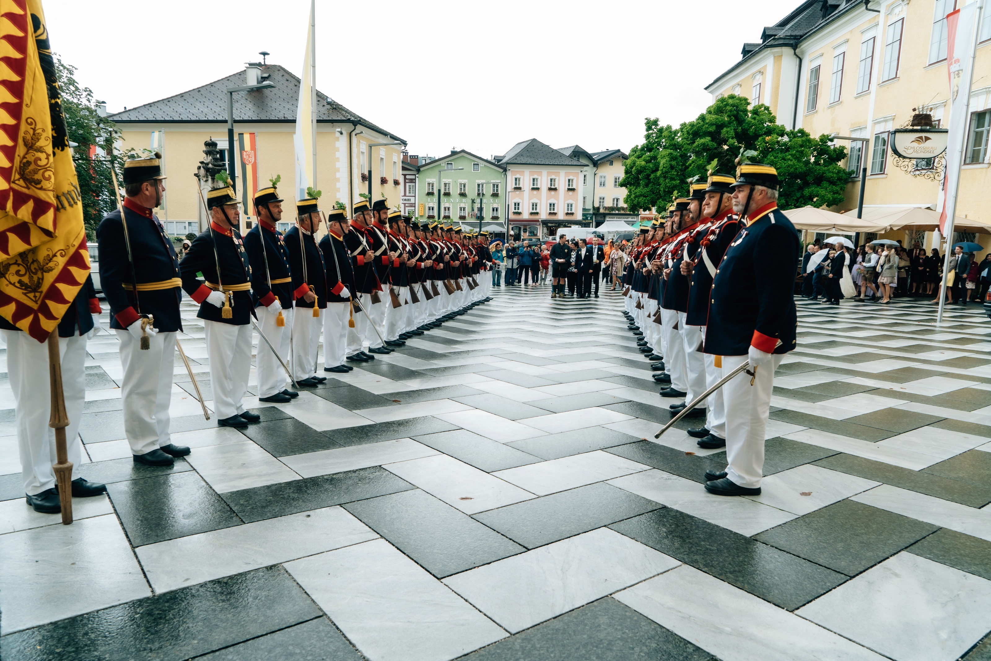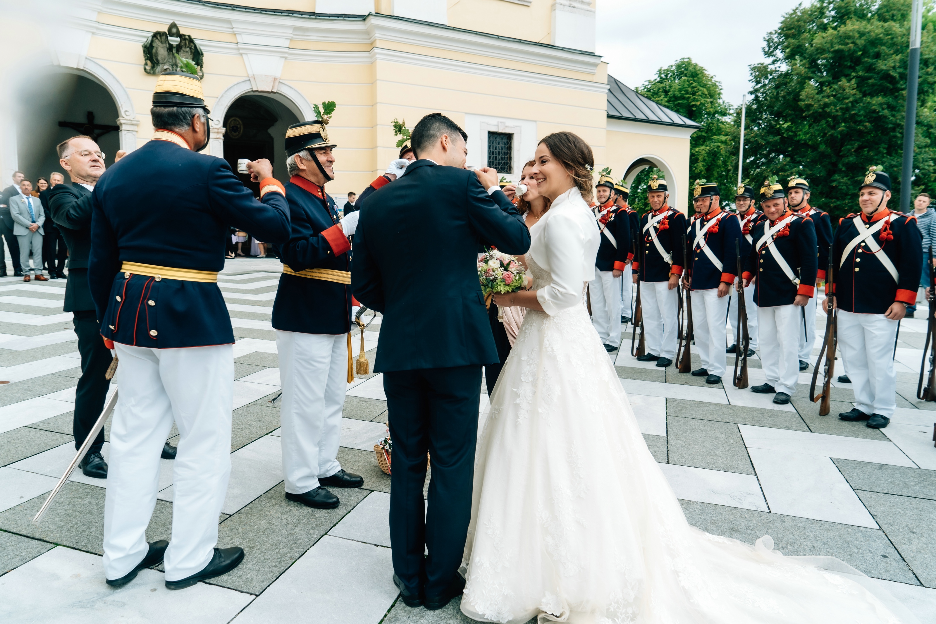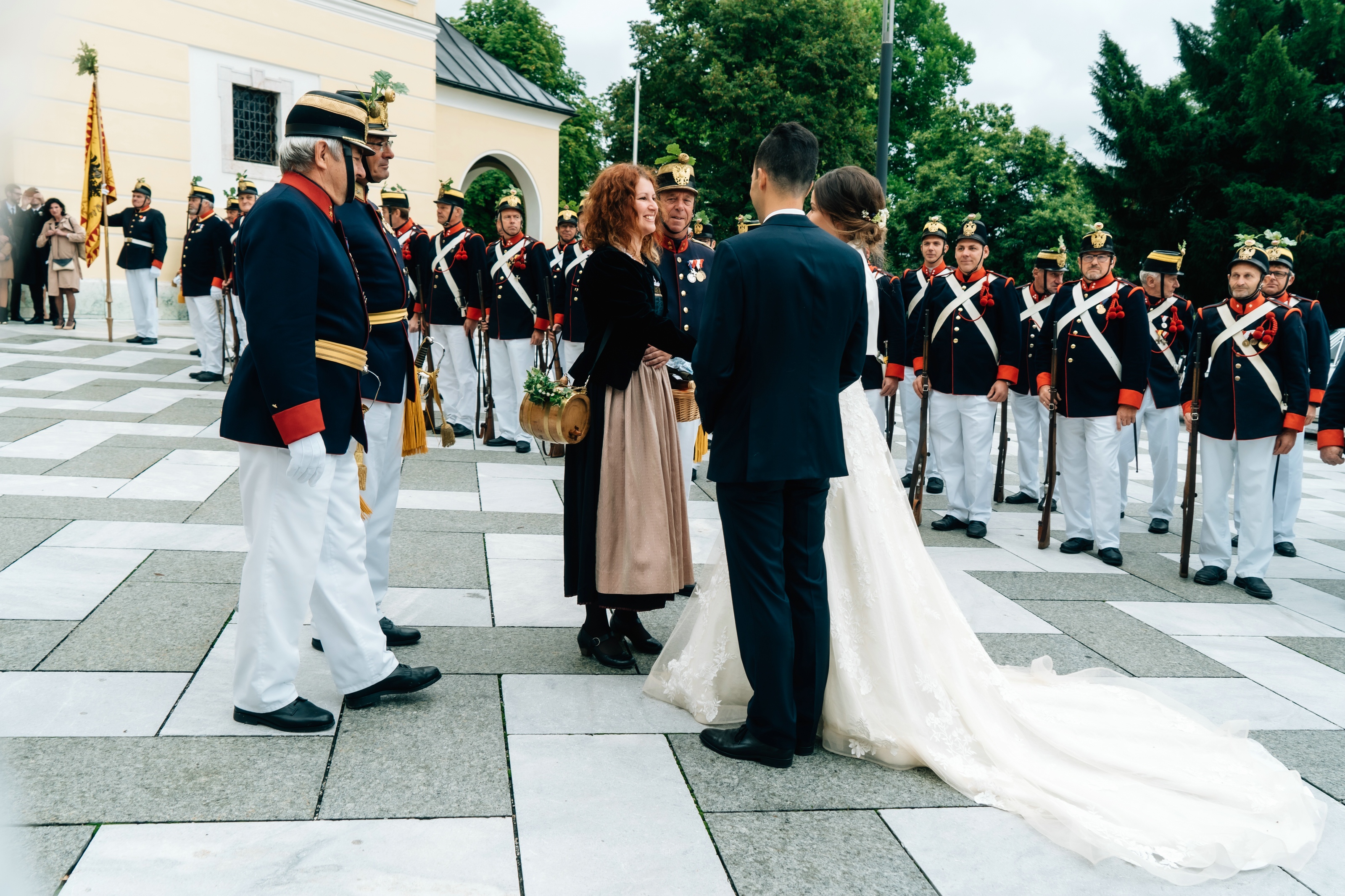 Obmann Mario Niederfriniger und seine Verlobte Charlotte Unterweger feierten am 7. September in der Basilika Mondsee ihre kirchliche Vermählung. Auch eine stark vertretene Bürgergarde folgte der Einladung und reiste zur Hochzeit an. Nach dem Einmarsch auf dem großen Kirchenvorplatz folgte der Einzug in die Kirche und ein stimmungsvoller Gottesdienst, wo sich die beiden Brautleute das Ja-Wort gaben. Beim Auszug stand die Bürgergarde dann unter den Augen zahlreicher Zaungäste Spalier. Nach der Meldung ließ sie das Brautpaar mit einer Ehrensalve hoch leben. Kommandant Hubert Niederfriniger, die Obmann-Stv. Herbert Schwarz und Josef Achleitner sowie Marketenderin Helene Enser gratulierten dem Brautpaar herzlich und stießen mit ihnen auf einen guten weiteren Lebensweg an. Im Anschluss waren alle Hochzeitsgäste zum Hochzeitsmahl im Gasthaus zum Fidelen Bauern in Oberwang eingeladen.