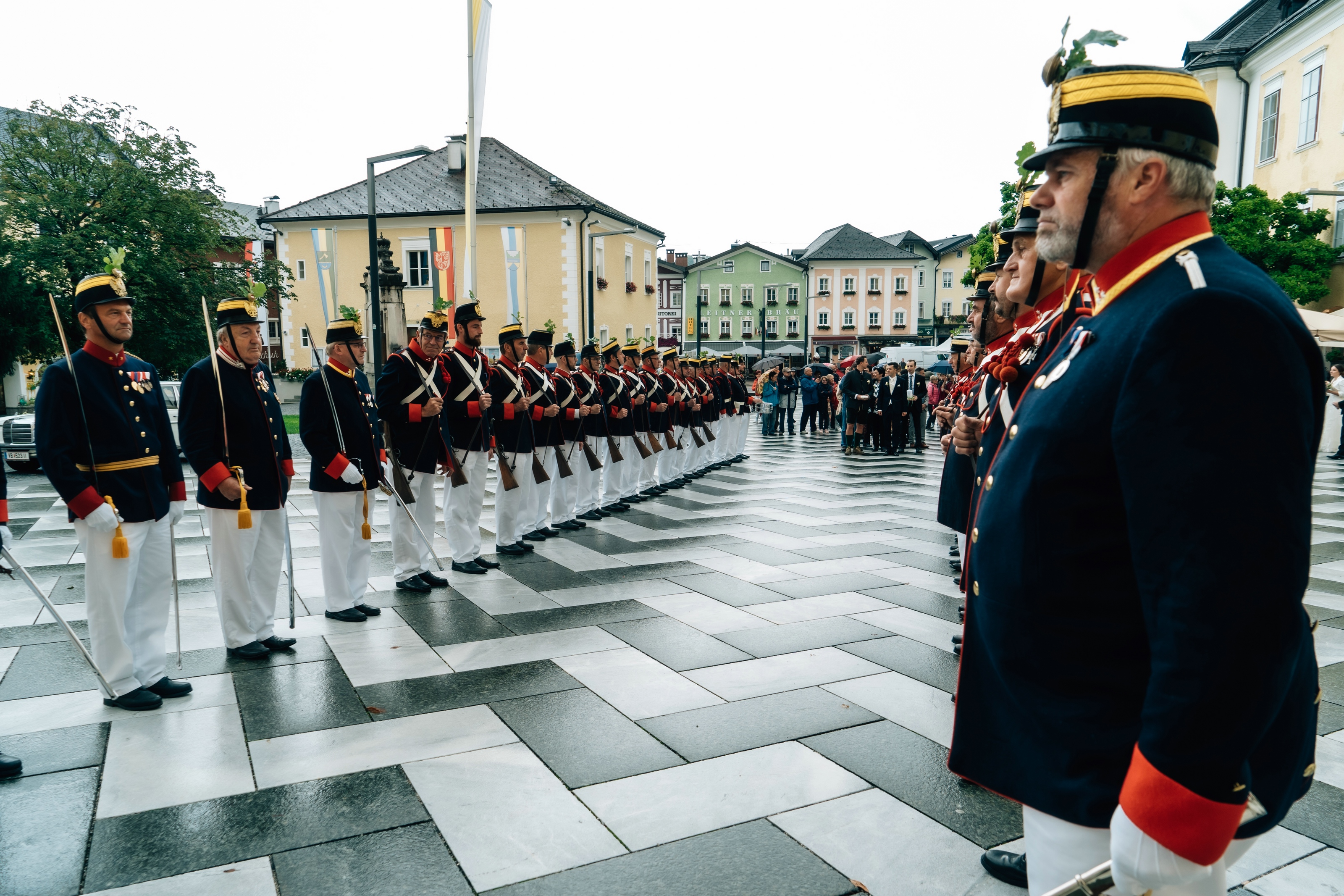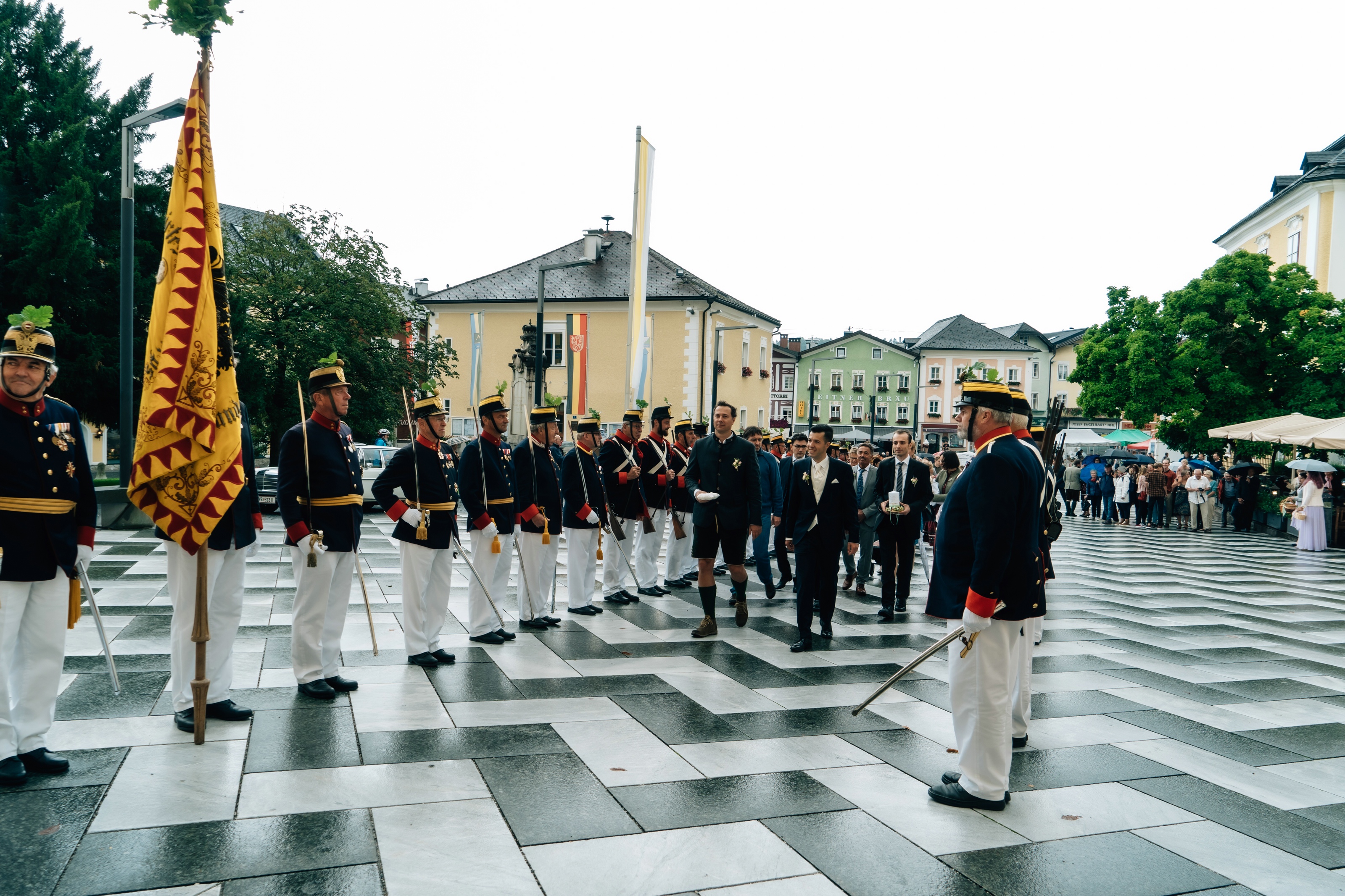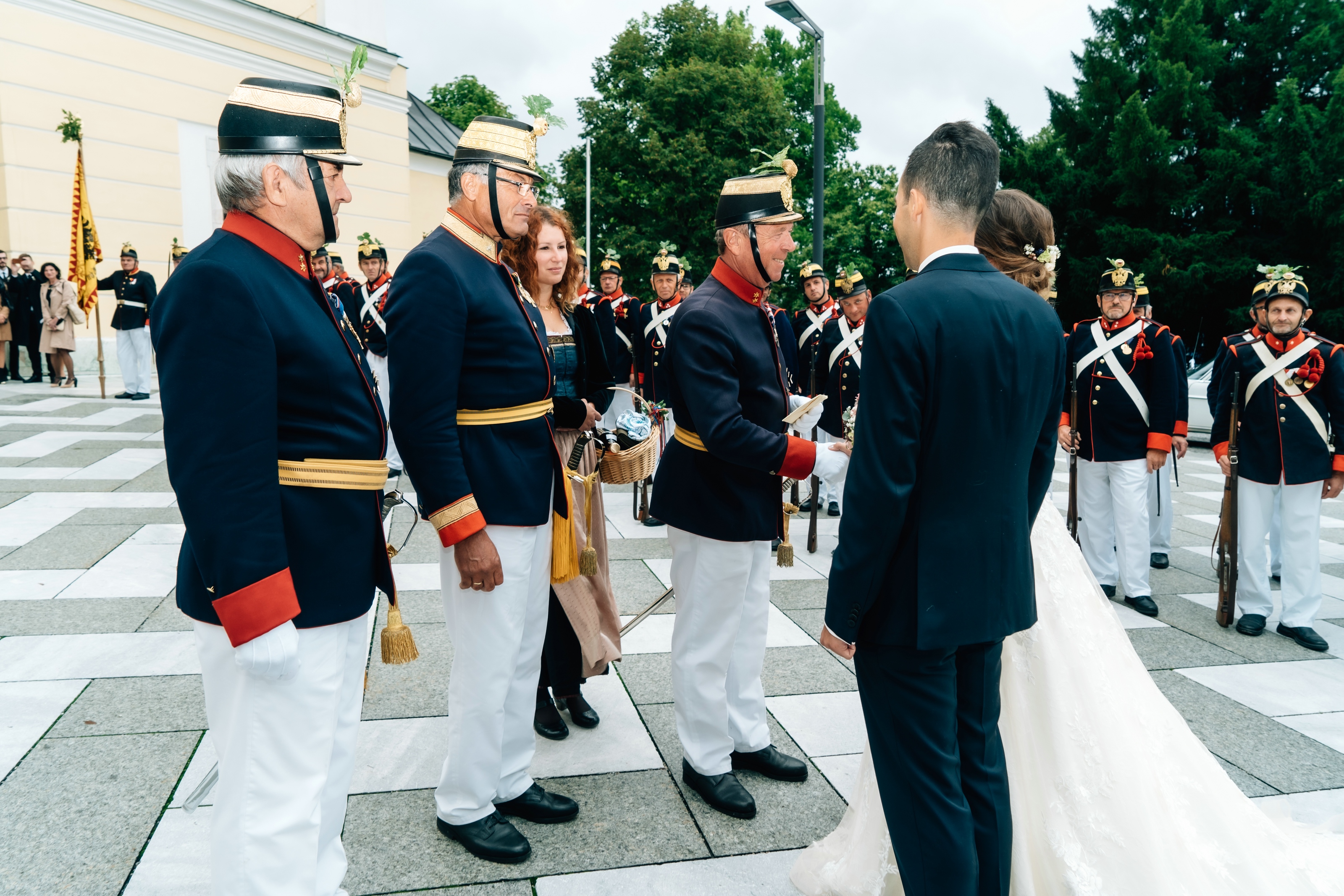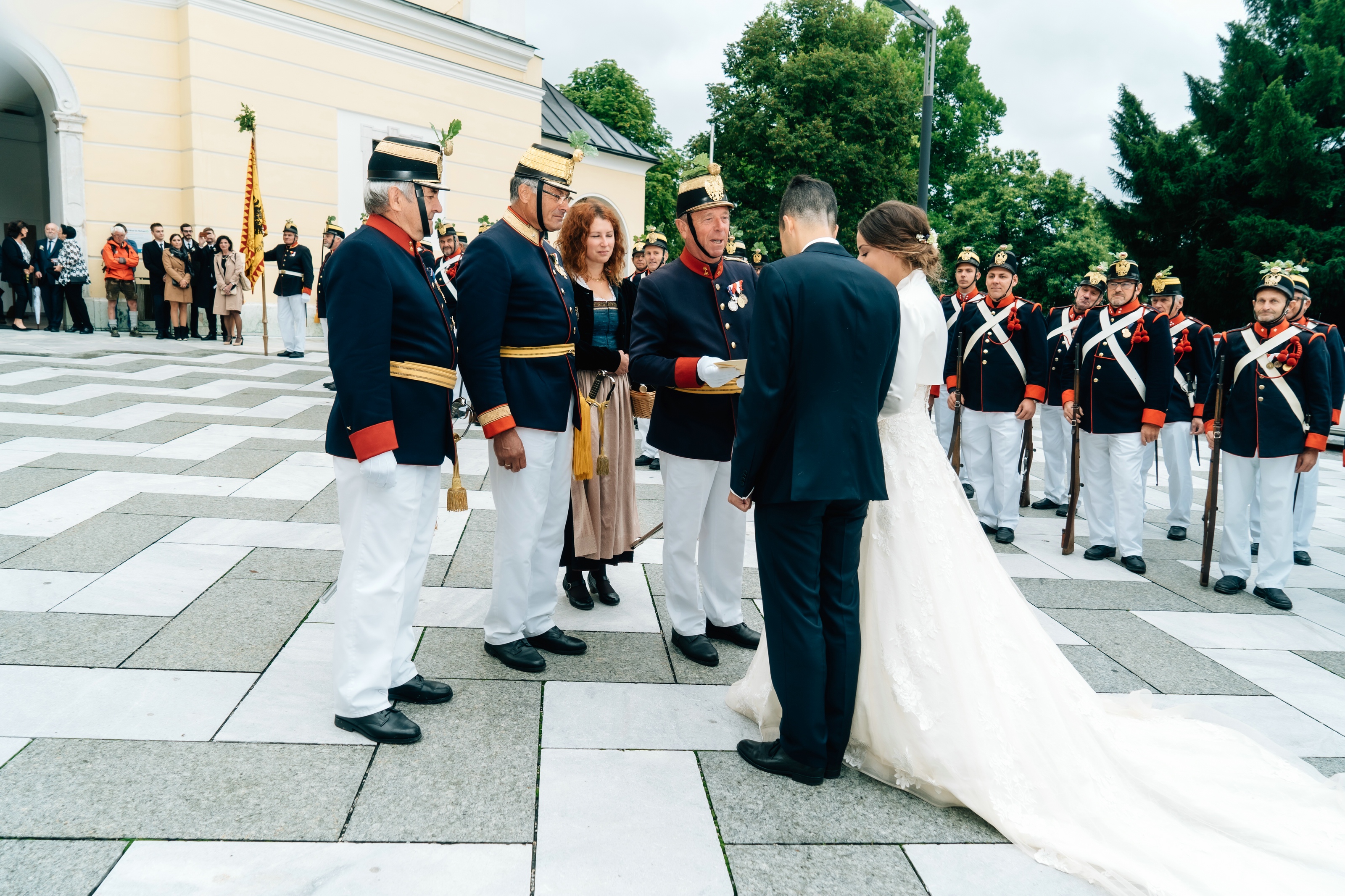 Obmann Mario Niederfriniger und seine Verlobte Charlotte Unterweger feierten am 7. September in der Basilika Mondsee ihre kirchliche Vermählung. Auch eine stark vertretene Bürgergarde folgte der Einladung und reiste zur Hochzeit an. Nach dem Einmarsch auf dem großen Kirchenvorplatz folgte der Einzug in die Kirche und ein stimmungsvoller Gottesdienst, wo sich die beiden Brautleute das Ja-Wort gaben. Beim Auszug stand die Bürgergarde dann unter den Augen zahlreicher Zaungäste Spalier. Nach der Meldung ließ sie das Brautpaar mit einer Ehrensalve hoch leben. Kommandant Hubert Niederfriniger, die Obmann-Stv. Herbert Schwarz und Josef Achleitner sowie Marketenderin Helene Enser gratulierten dem Brautpaar herzlich und stießen mit ihnen auf einen guten weiteren Lebensweg an. Im Anschluss waren alle Hochzeitsgäste zum Hochzeitsmahl im Gasthaus zum Fidelen Bauern in Oberwang eingeladen.