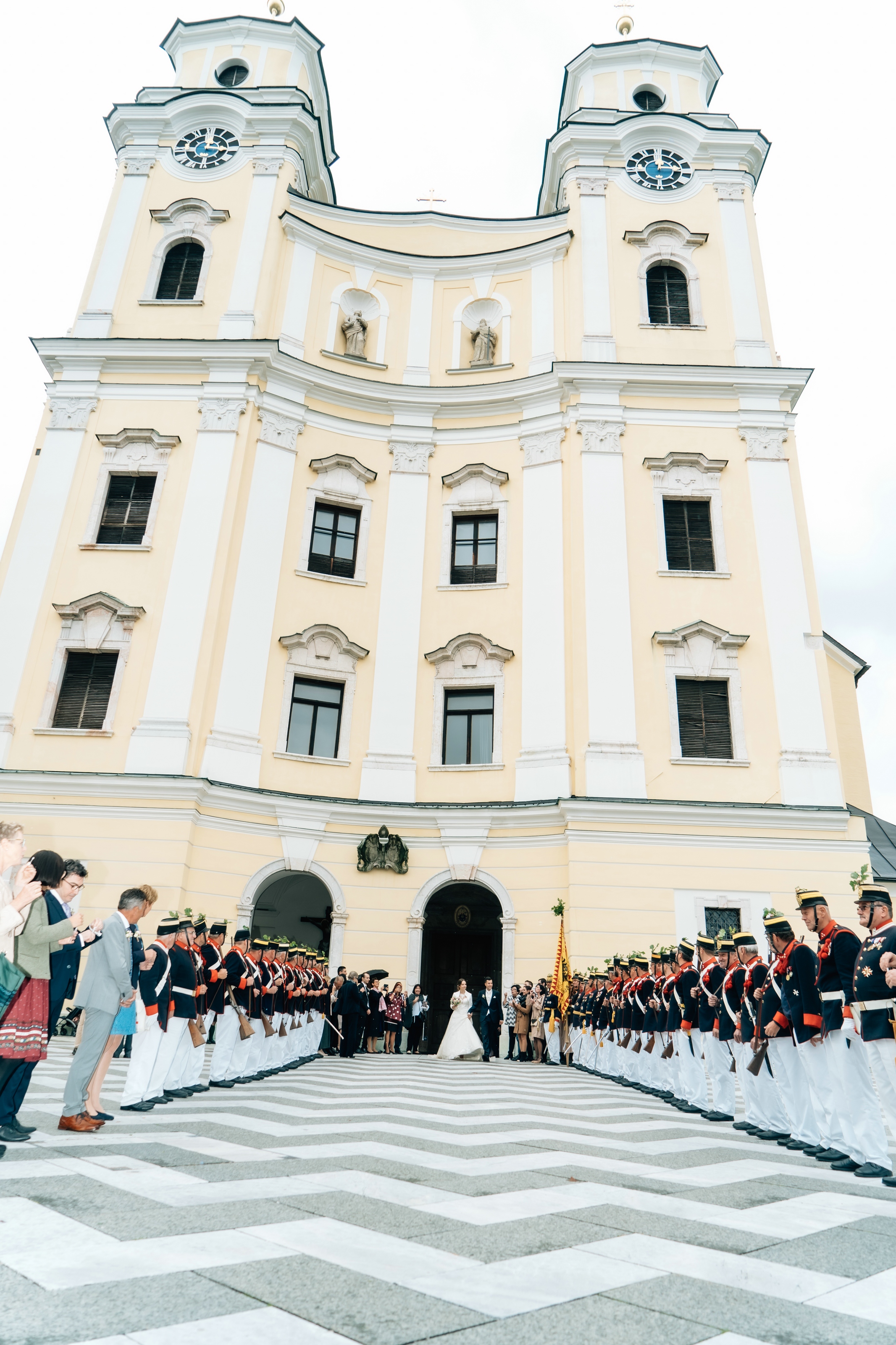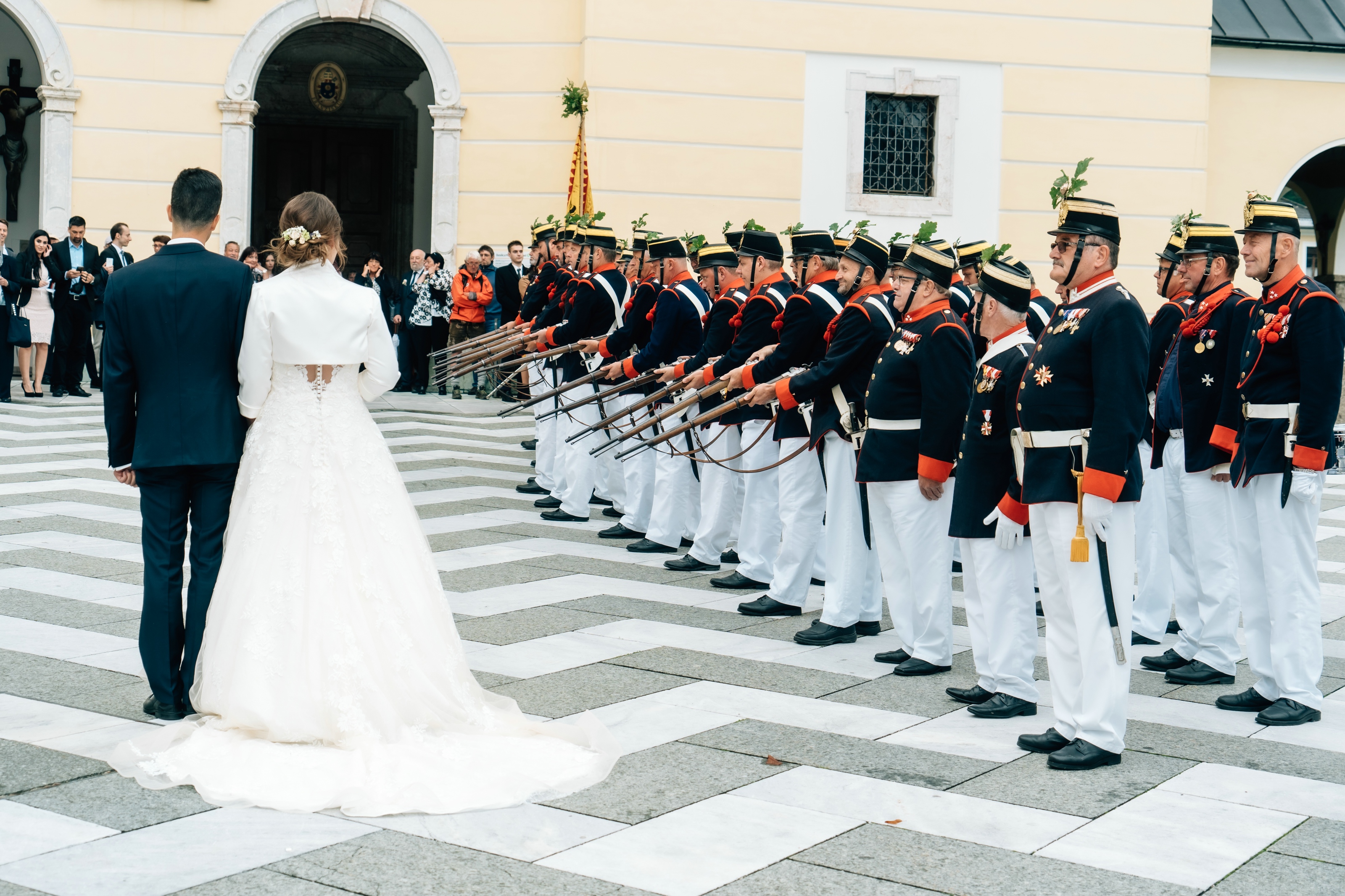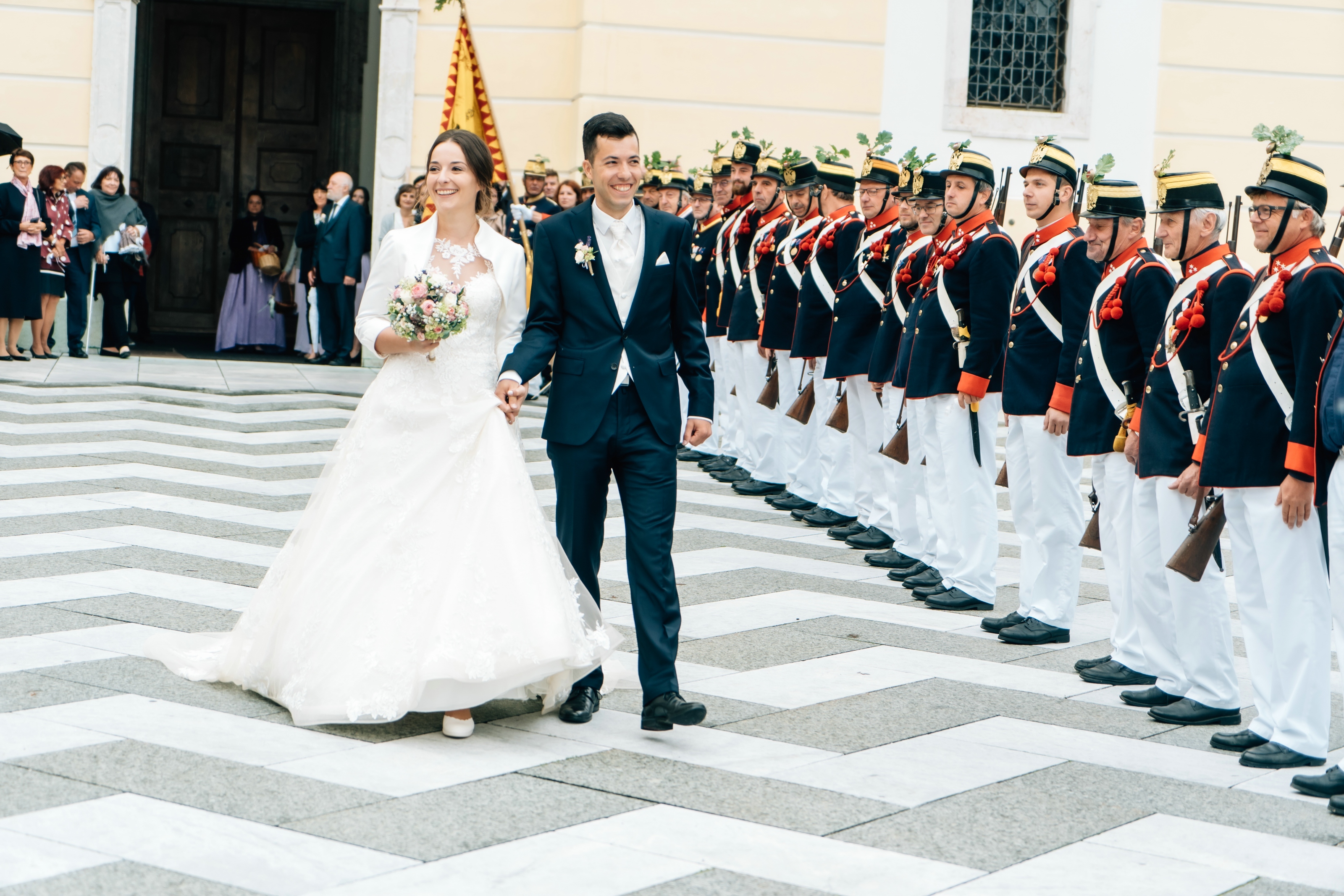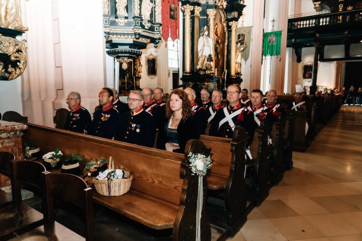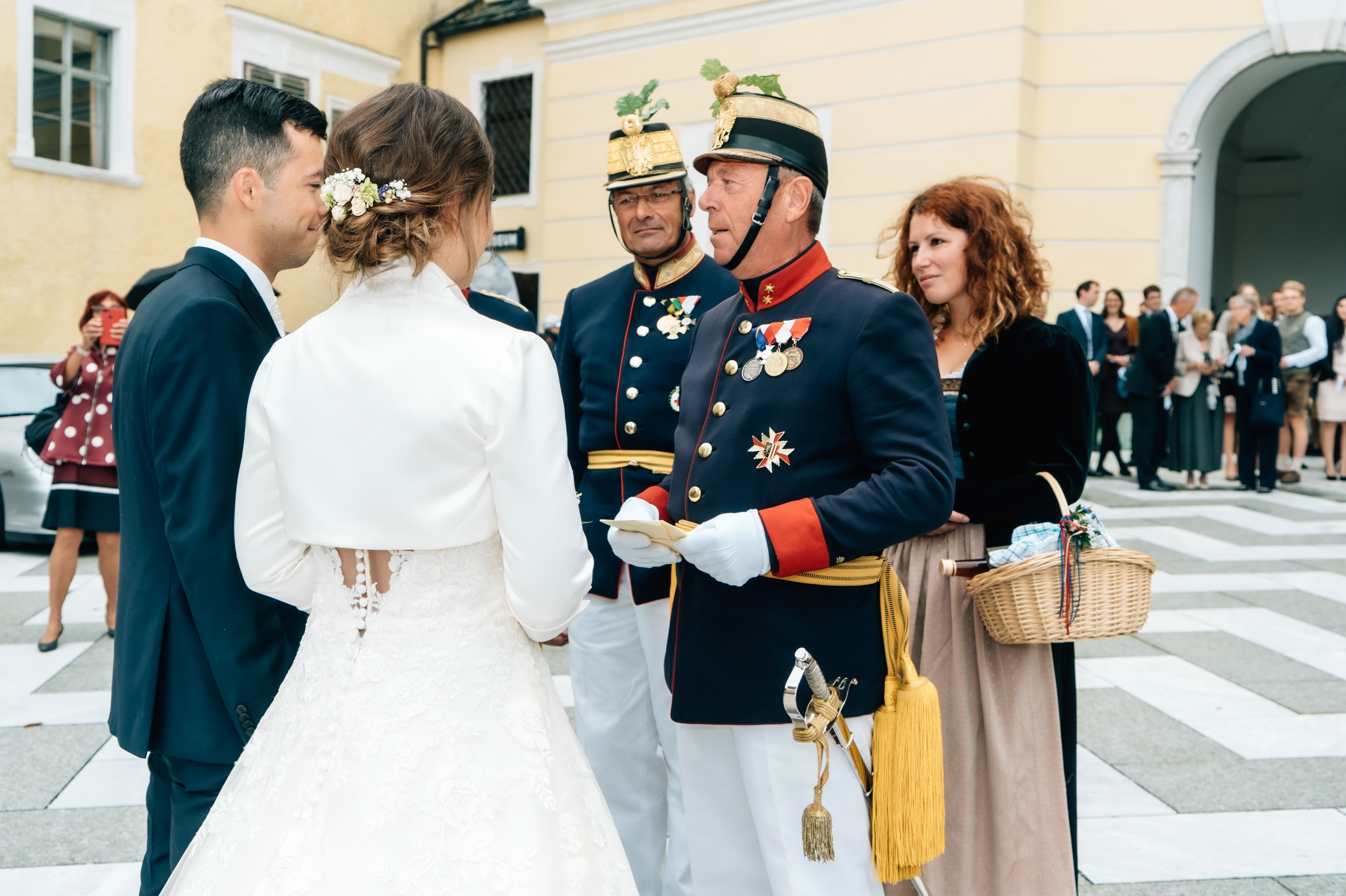 Obmann Mario Niederfriniger und seine Verlobte Charlotte Unterweger feierten am 7. September in der Basilika Mondsee ihre kirchliche Vermählung. Auch eine stark vertretene Bürgergarde folgte der Einladung und reiste zur Hochzeit an. Nach dem Einmarsch auf dem großen Kirchenvorplatz folgte der Einzug in die Kirche und ein stimmungsvoller Gottesdienst, wo sich die beiden Brautleute das Ja-Wort gaben. Beim Auszug stand die Bürgergarde dann unter den Augen zahlreicher Zaungäste Spalier. Nach der Meldung ließ sie das Brautpaar mit einer Ehrensalve hoch leben. Kommandant Hubert Niederfriniger, die Obmann-Stv. Herbert Schwarz und Josef Achleitner sowie Marketenderin Helene Enser gratulierten dem Brautpaar herzlich und stießen mit ihnen auf einen guten weiteren Lebensweg an. Im Anschluss waren alle Hochzeitsgäste zum Hochzeitsmahl im Gasthaus zum Fidelen Bauern in Oberwang eingeladen.