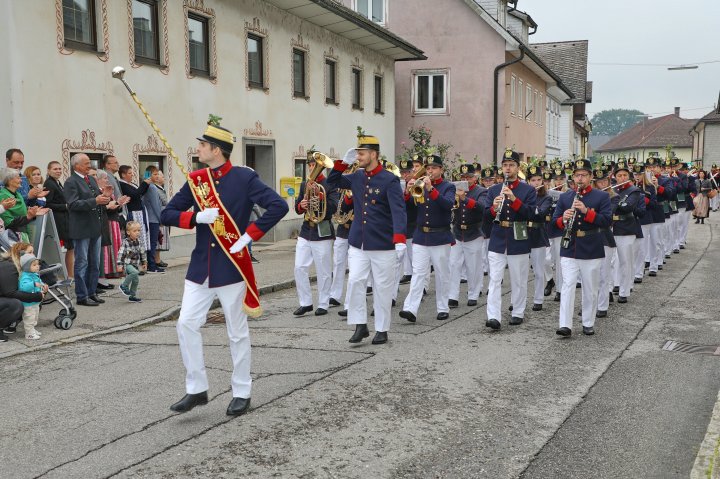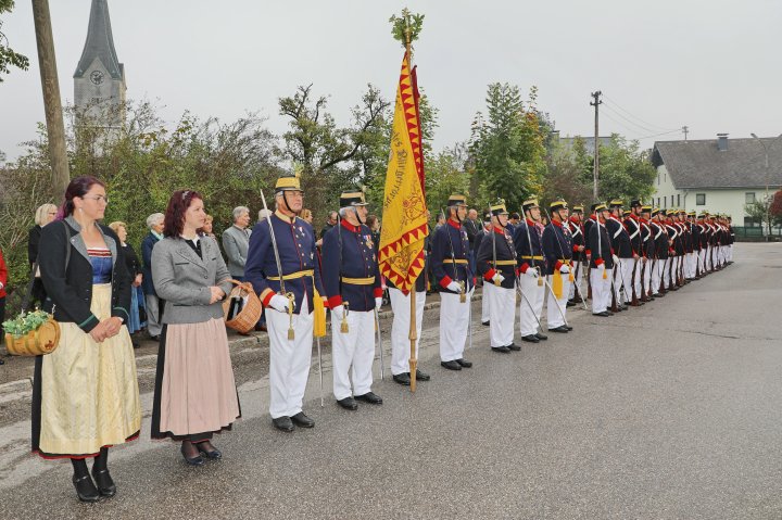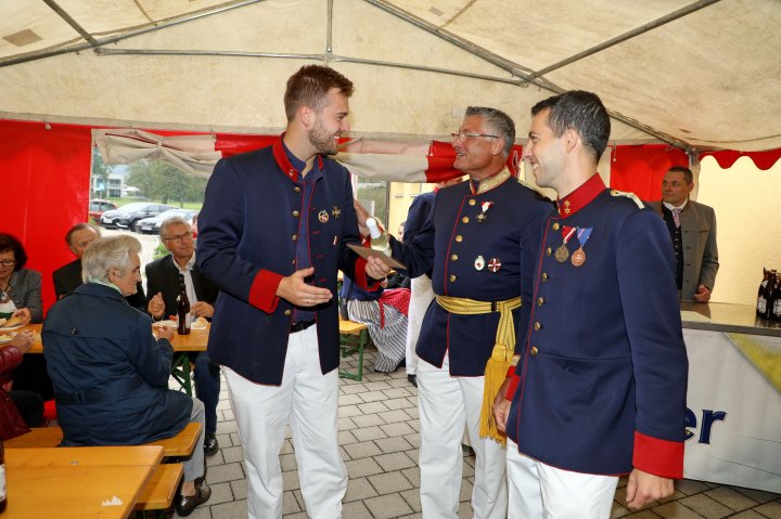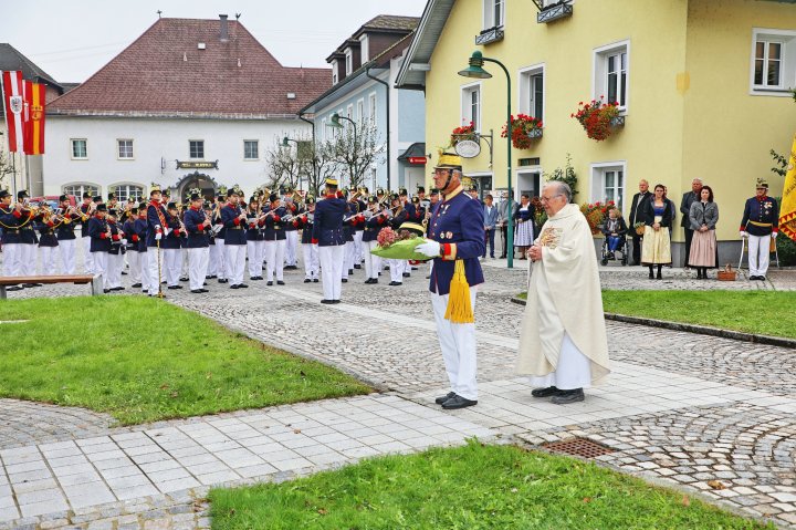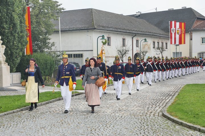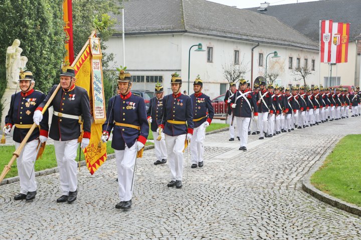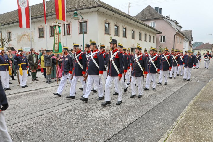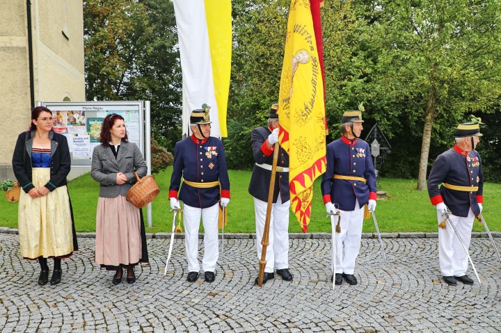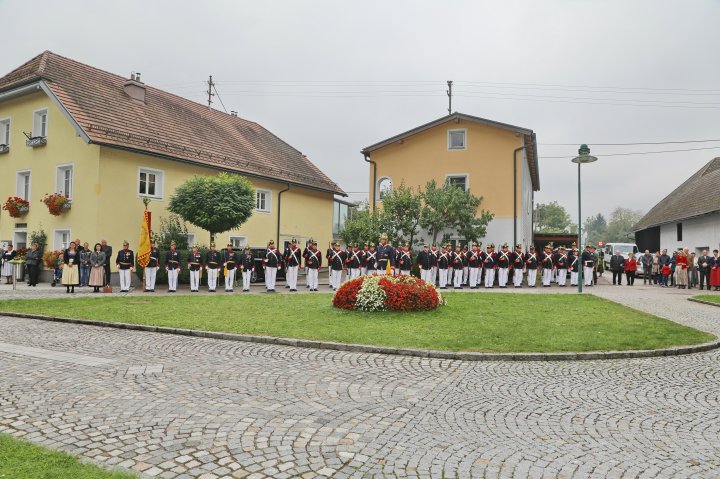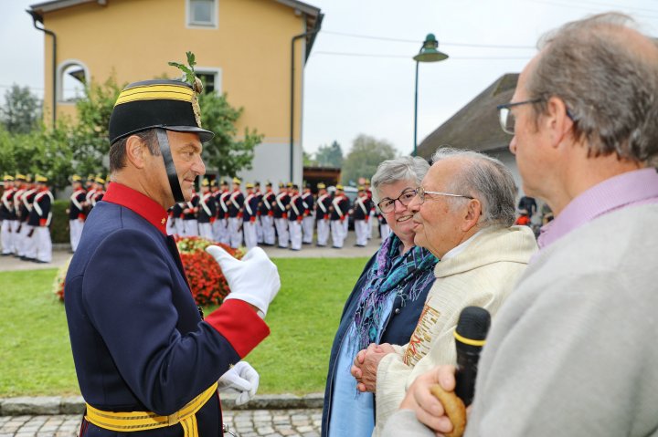 Am 4. September rückte eine 14-köpfige Abordnung der Bürgergarde Regau anlässlich der jährlichen Schlossbergmesse nach Friedburg aus. Zunächst war der 15 Minuten lange, steile Einmarsch zum Schlossberg zu bewältigen. Oben angekommen tat sich ein wahrer Kraftplatz auf. Begonnen wurde mit einer Feldmesse, wo die Bürgergarde Regau einen Salut zur Wandlung abfeuerte. Im Festakt eingebunden war die Segnung und Überreichung eines Fahnenbandes der neuen Fahnenpatin. Weiters folgte ein Lauffeuer der Schützen von Treubach und Vöcklamarkt. Der Höhepunkt war die Überreichung der höchsten Auszeichnung des Landesverbandes, des Sterns zum Kommandantenkreuz, an Mjr. Alois Stampfl durch den Landeskommandanten Mjr. Hubert Niederfriniger. Nach einem Marsch durch Friedburg zum Festzelt genossen die Beteiligten dann den gemütlichen und kameradschaftlichen Teil der Ausrückung, bevor die Abordnung direkt zur Regauer Dorf Roas zum Informationsstand der Bürgergarde Regau fuhr.